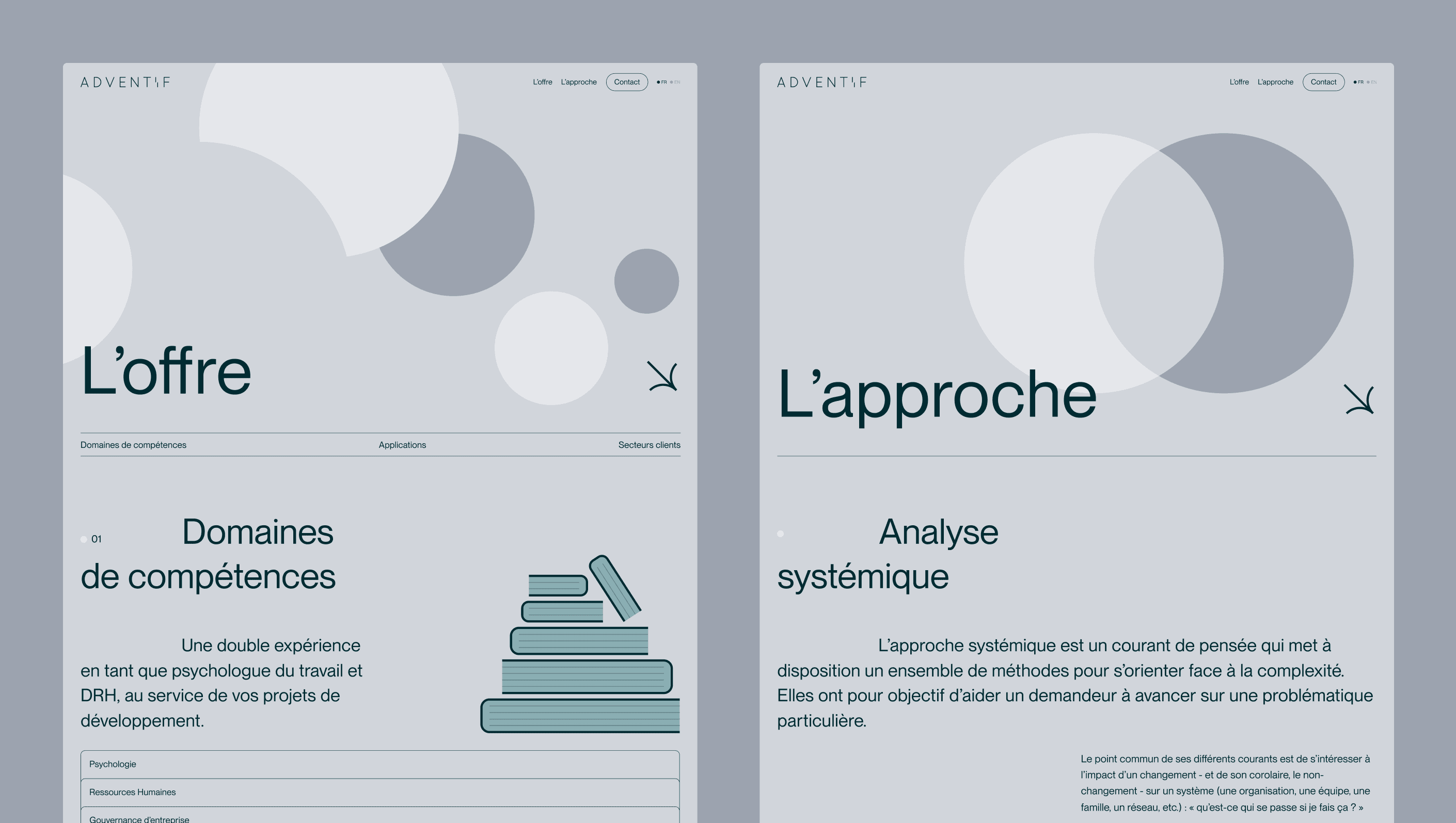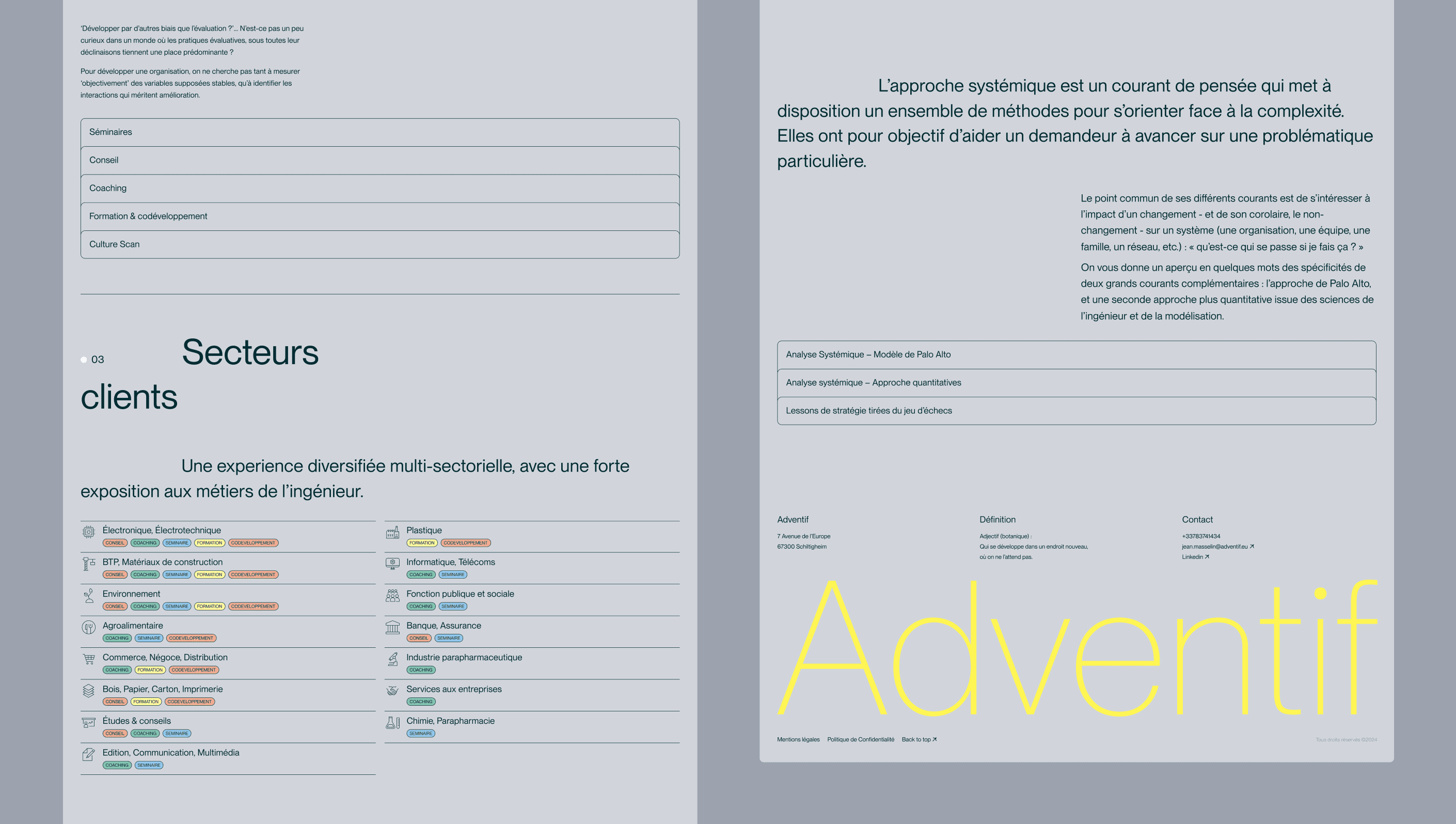 A complete redesign focused on modernity and user engagement for this firm specializing in systemic analysis. The clean design highlights the three areas of expertise around work psychology, human resources, and foreign languages and cultures, with a visual structure that facilitates understanding of complex services.