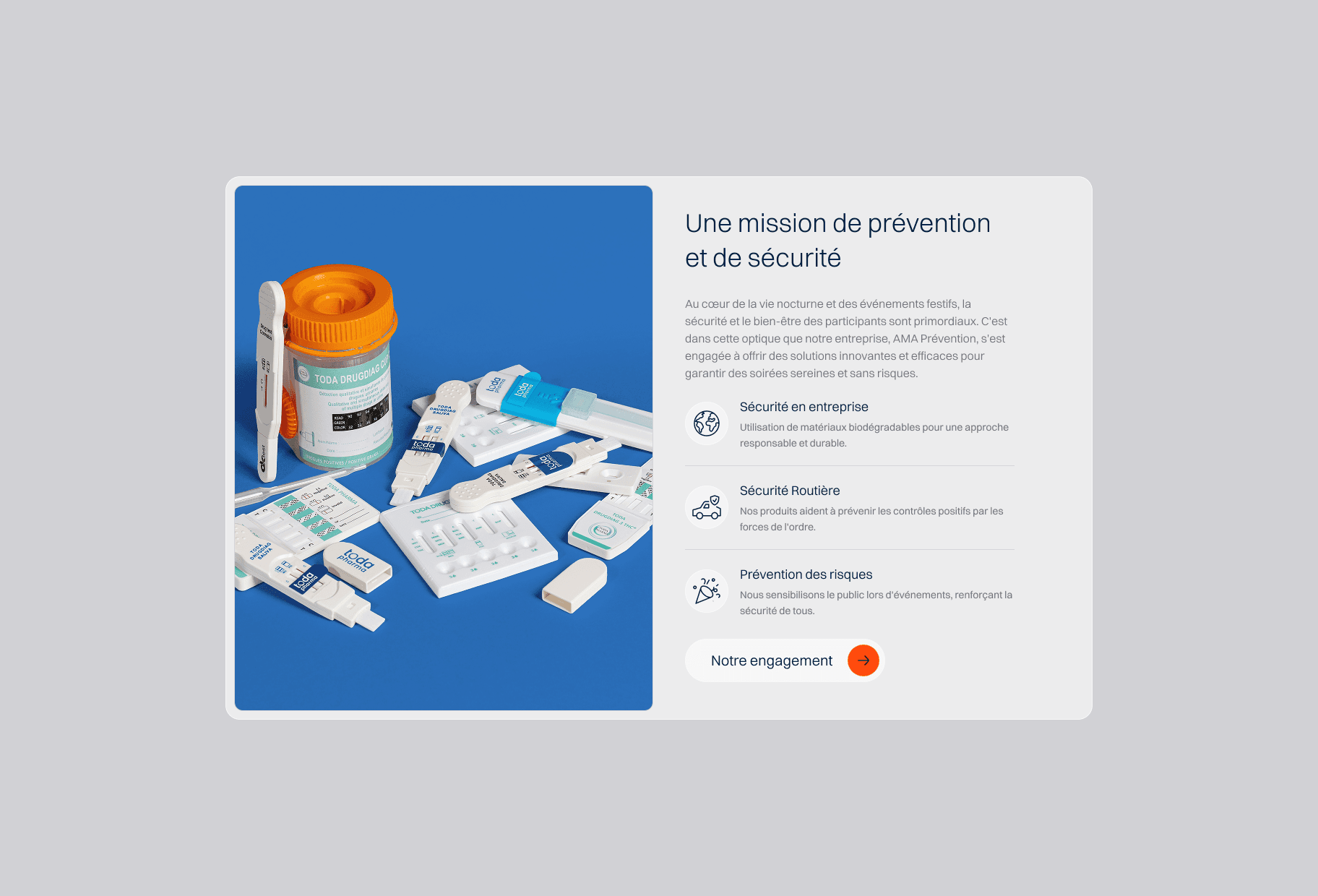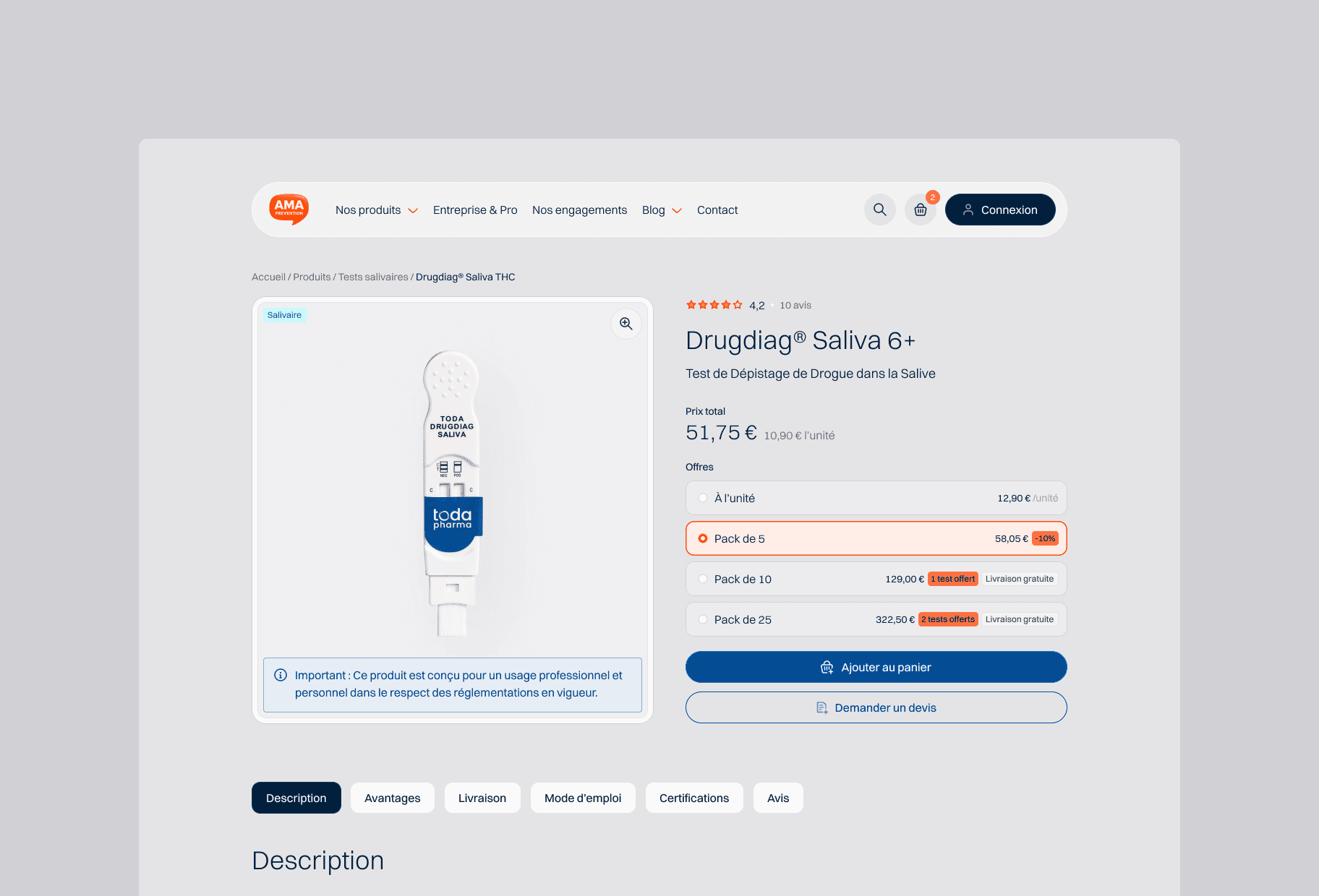 Specialized in prevention and road safety solutions, AMA Prévention serves healthcare professionals, businesses, law enforcement and individuals concerned with preventing substance-related risks. AMA Prévention offers a complete range of certified saliva, urine and breathalyzer screening tests.
