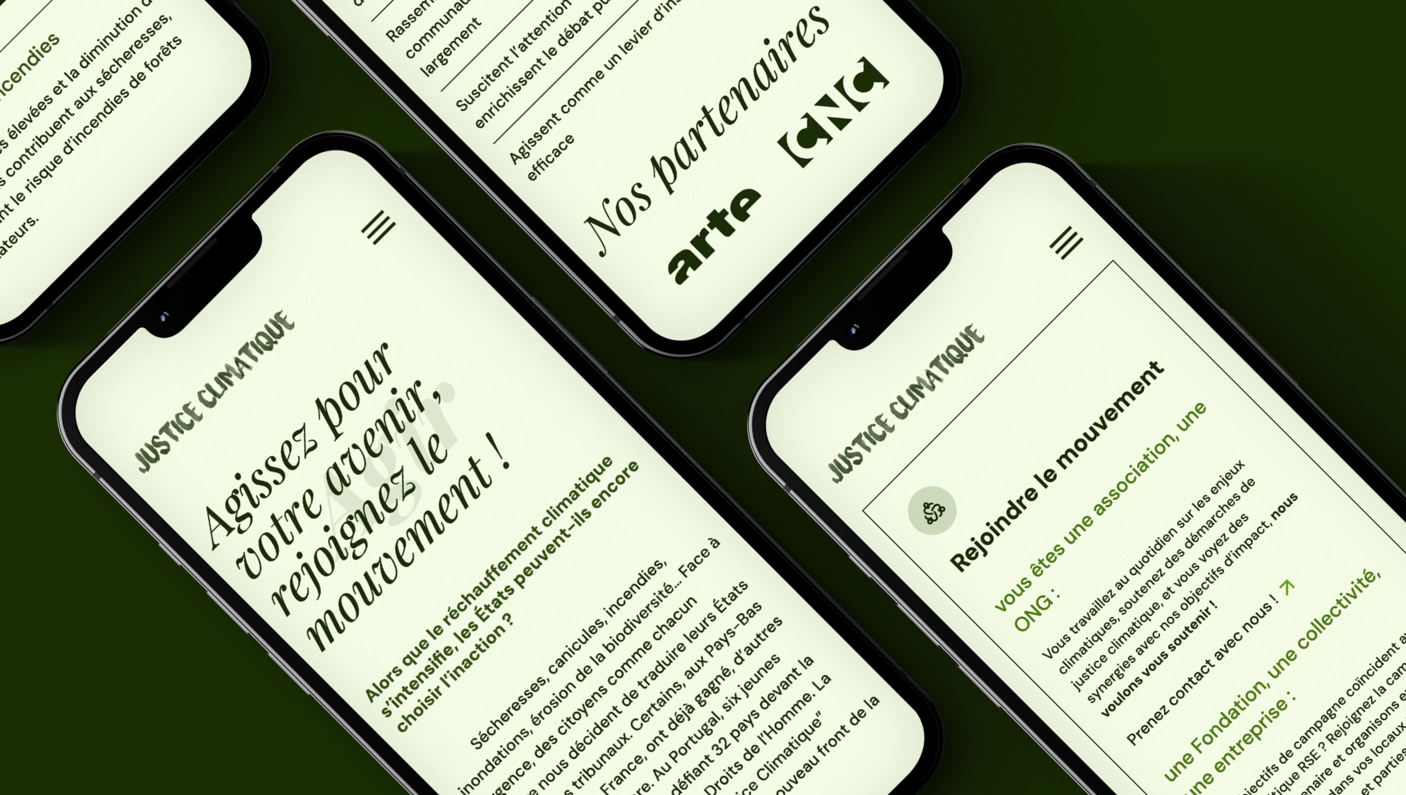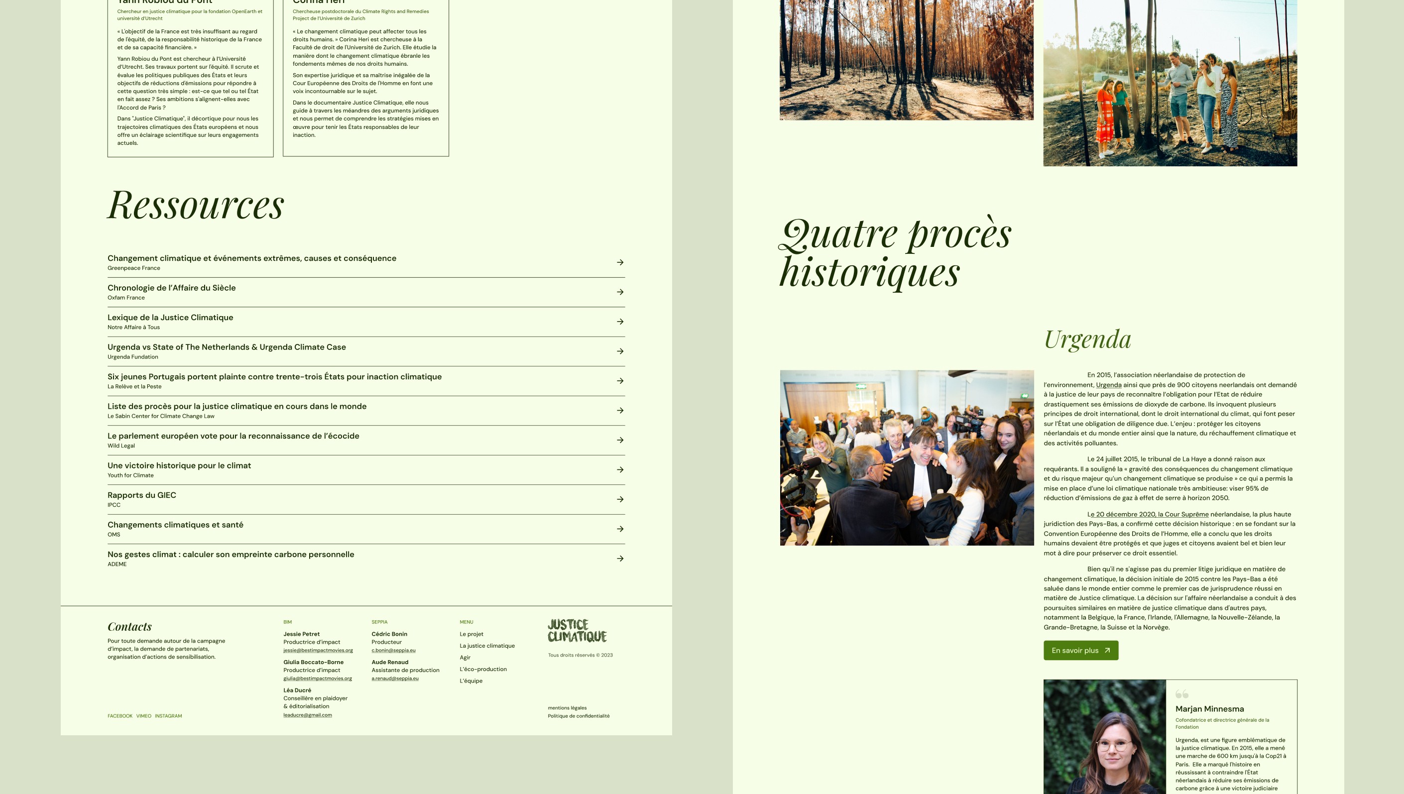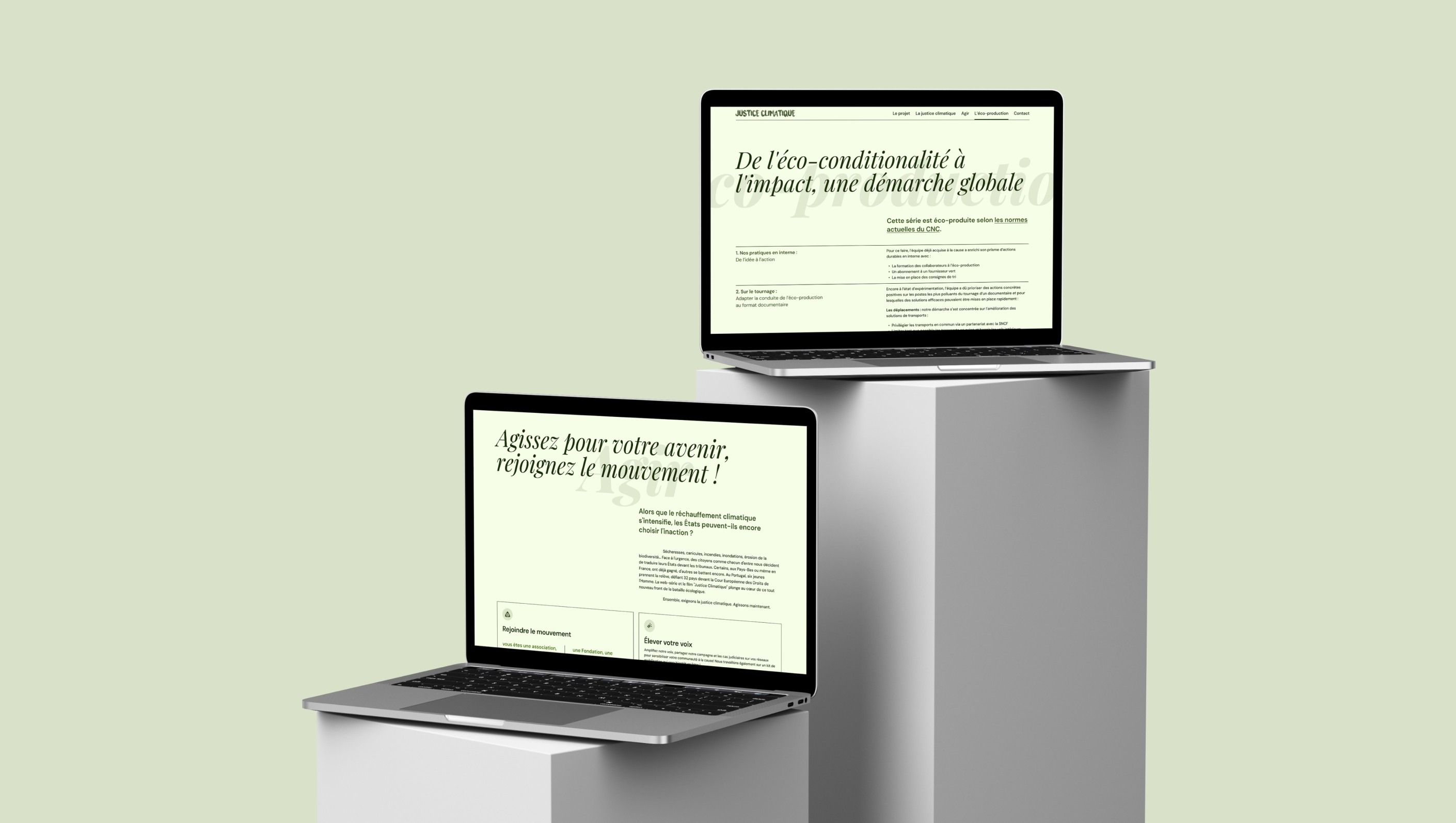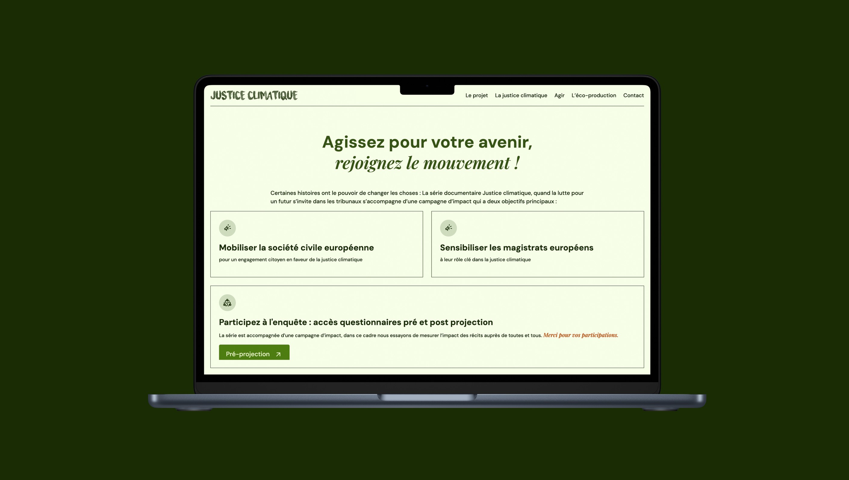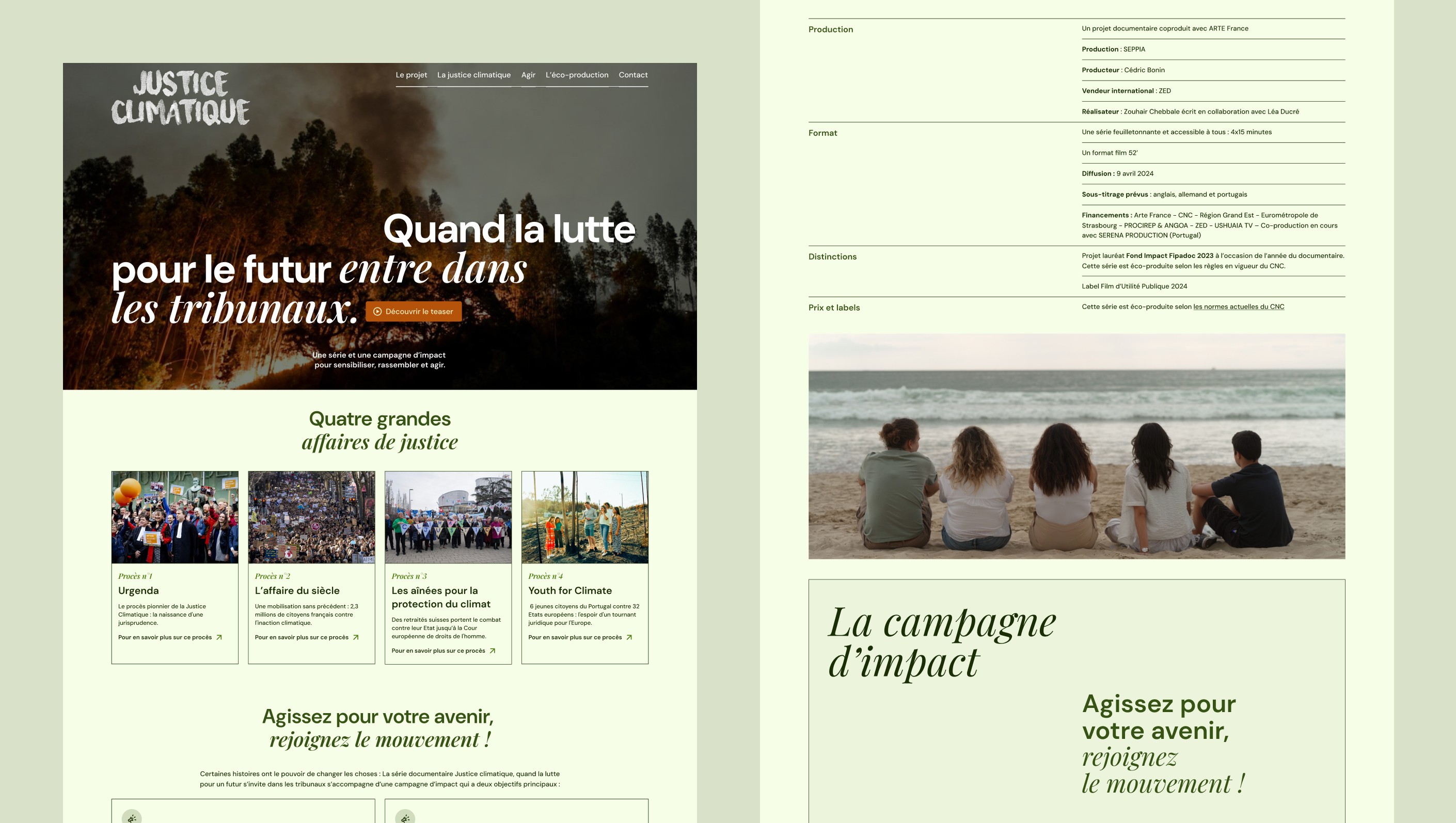 A digital platform designed to accompany the documentary series "Climate Justice: When the Fight for a Future Enters the Courtrooms" broadcast on ARTE. The design favors a strong editorial approach that transforms complex legal issues into accessible and engaging content to raise public awareness about climate justice.