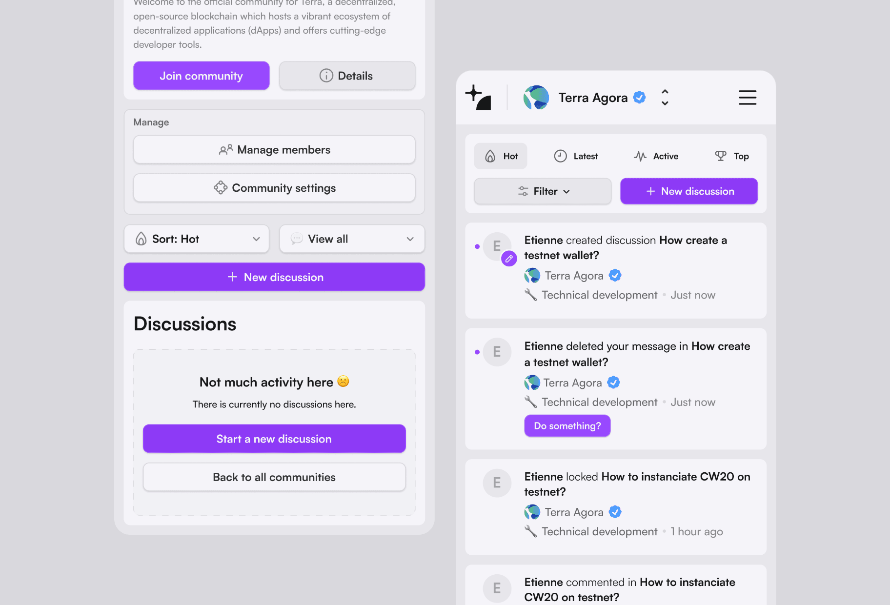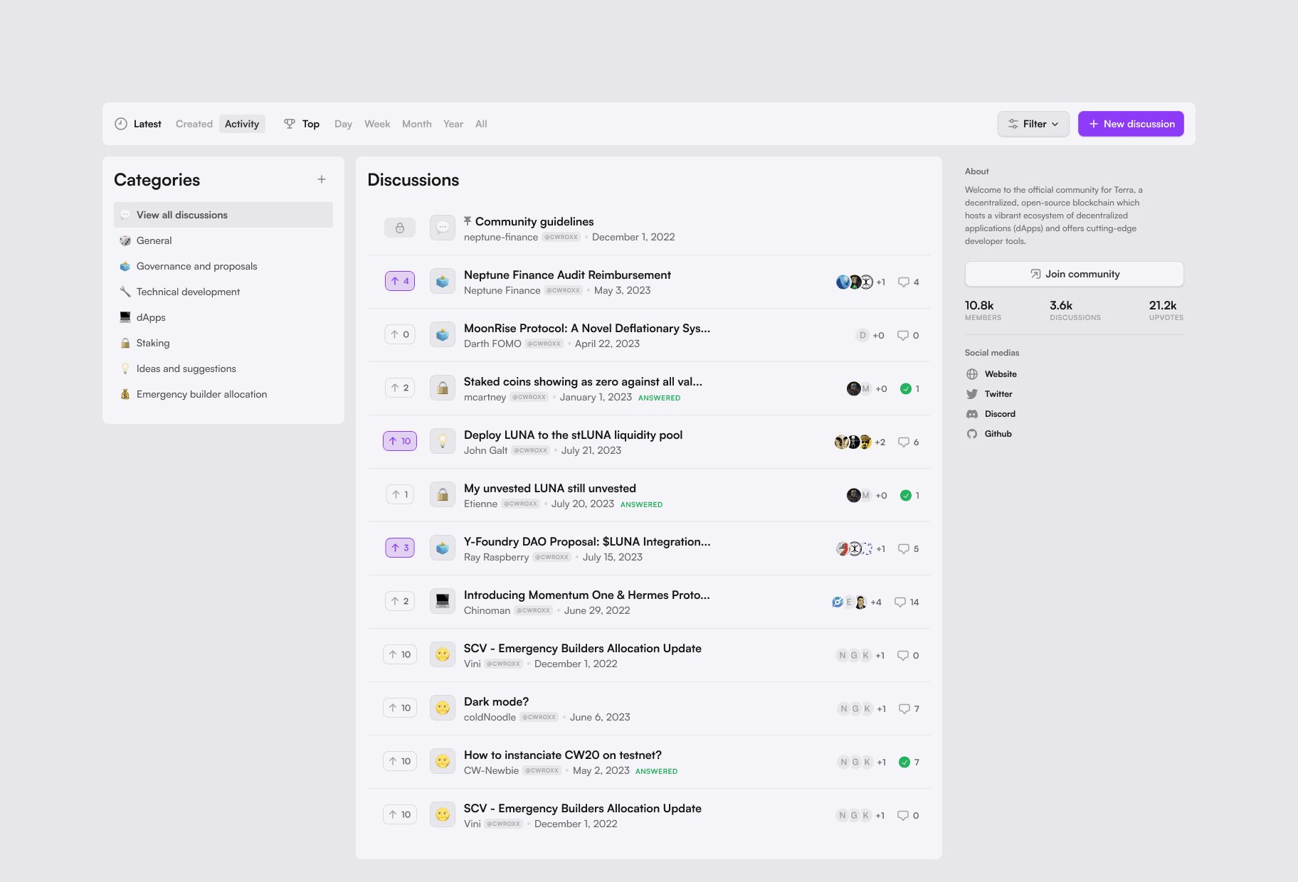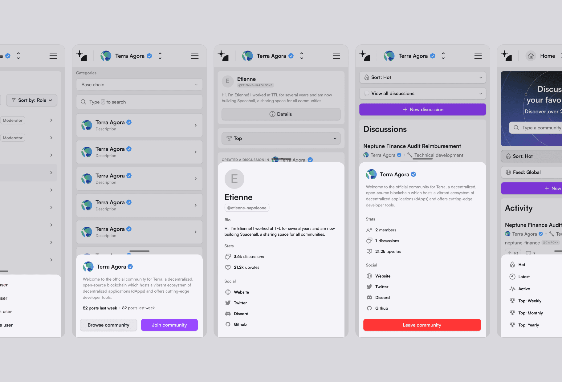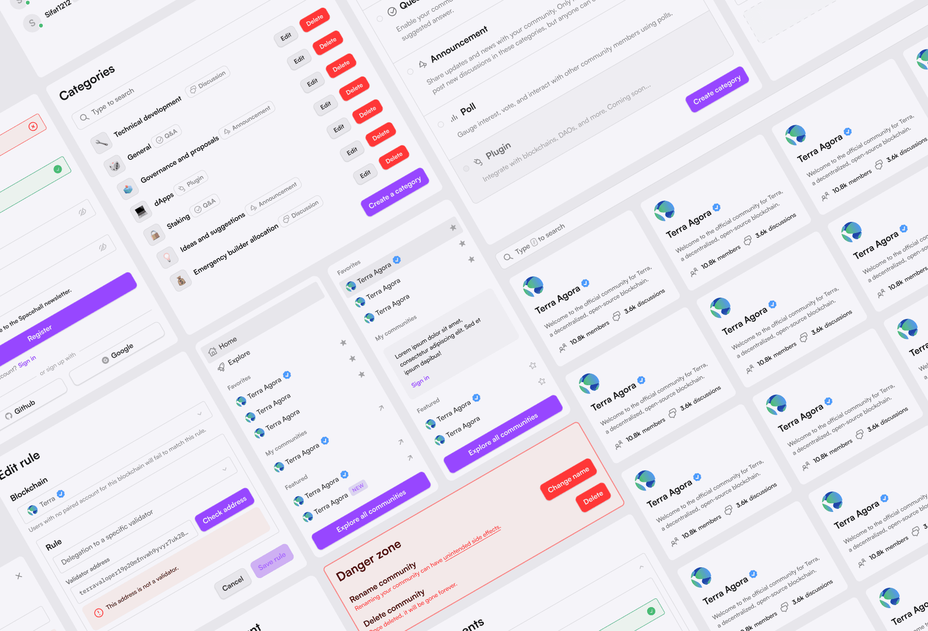 Spacehall is a Web 3 communities social network which features a modern interface designed for blockchain community exchanges. The design system employs a clean, functional approach that prioritizes readability and intuitive navigation for managing complex technical discussions.