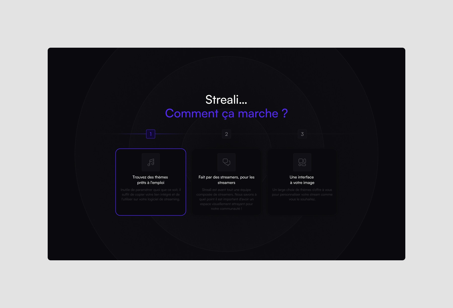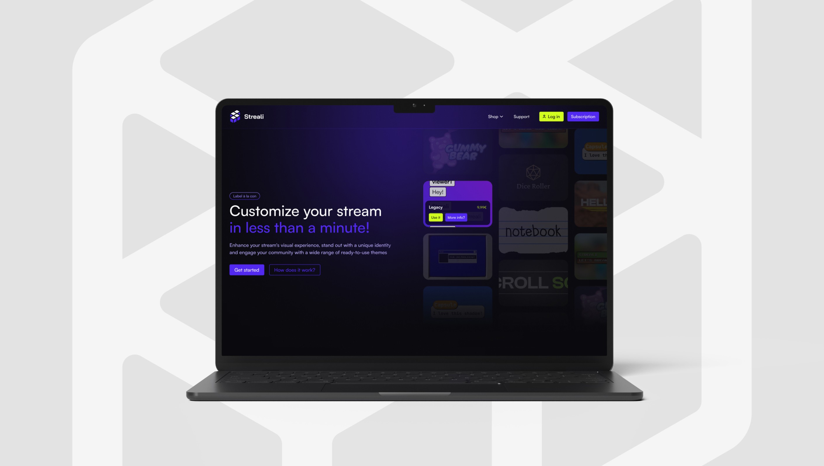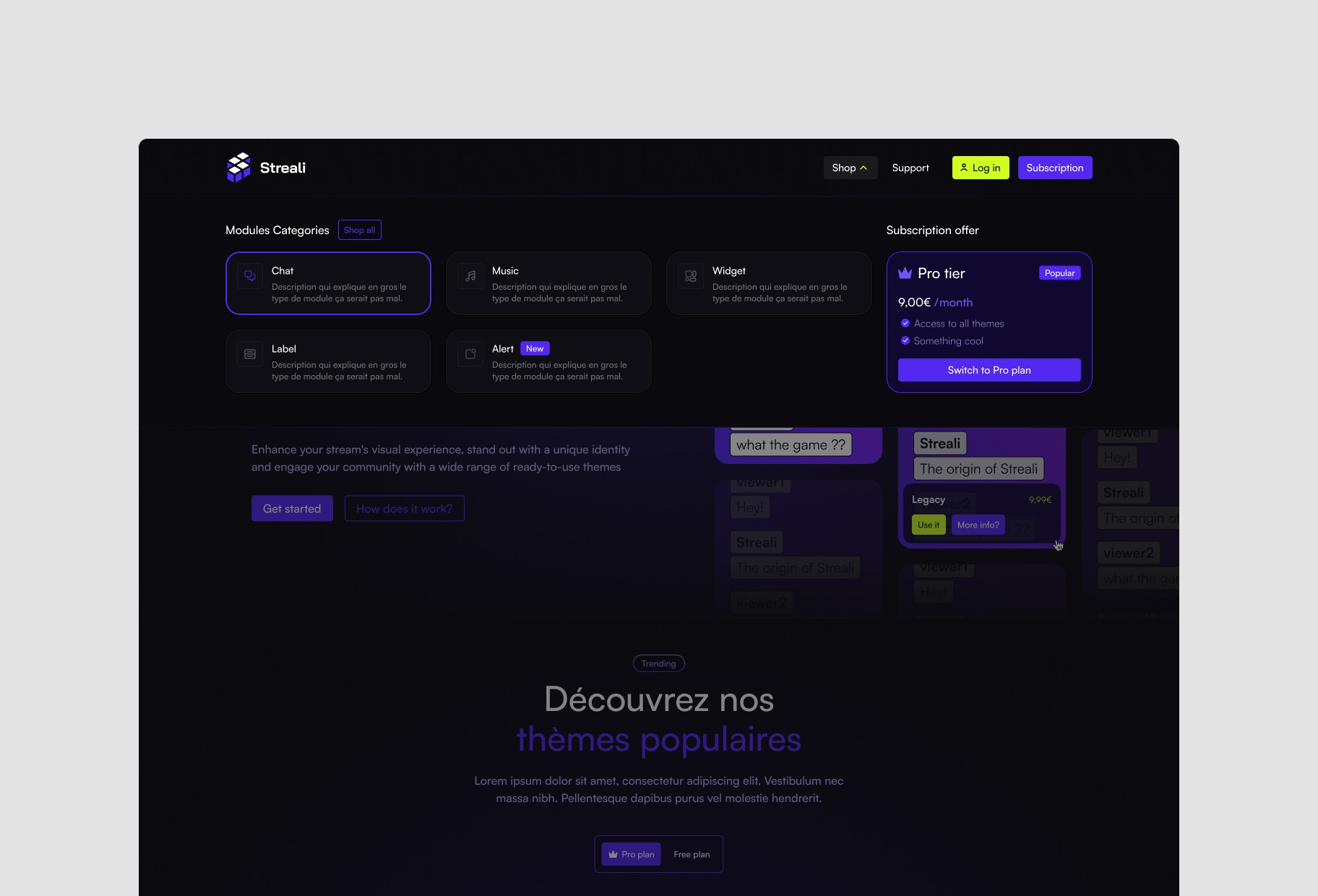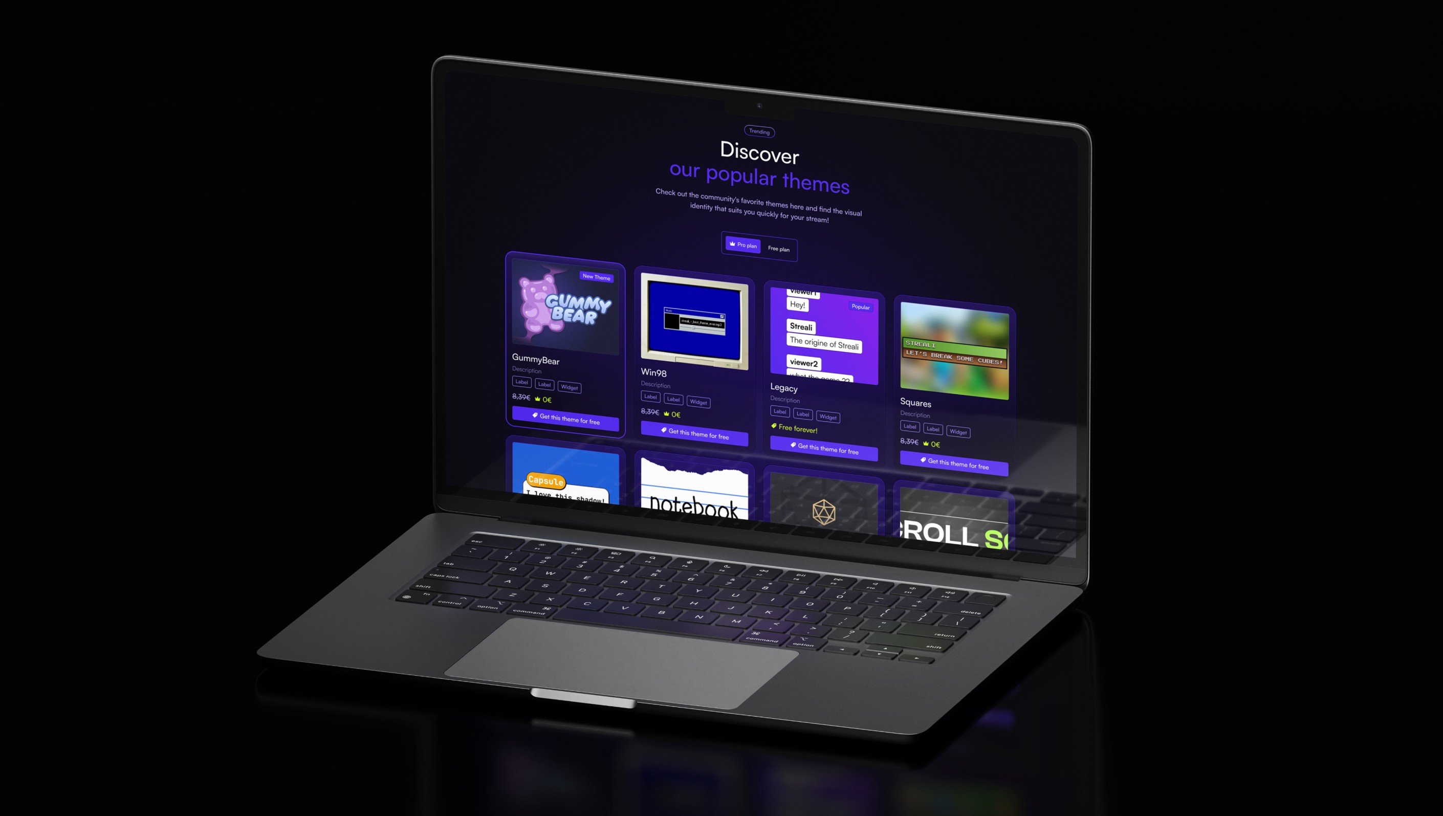 An e-commerce platform dedicated to Twitch content creators who want to customize their stream in one minute with ready-to-use visual themes. The design favors a modern marketplace approach with clear navigation between different categories: chat, music, labels, and widgets.